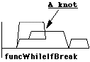 The break jumps to the end of the while statement and causes a knot. A knot is where the control flow crosses the boundary of another statement block and indicates unstructured code. In this case, break jumps to the end of the while statement and the next part of the program, the if statement, is executed.